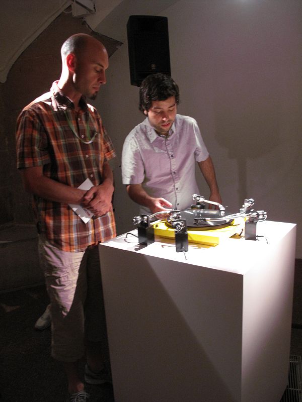 18.06.2009Unos visitantes prueban el plato con cinco cabezales de Yuri Suzuki.rne -