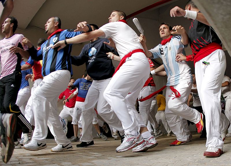 PAM04 PAMPLONA, 09/07/2010.- Un grupo de mozos entra a la Plaza de Toros de Pamplona durante el tercer encierro de los sanfermines 2010, con toros de la ganadería gaditana de Fuente Ymbro que, con una duración de hasta los seis minutos y veintitrés segundos ha dado lugar a constantes momentos de tensión y peligro al volverse repetidamente sobre sus pasos uno de los morlacos y embestir contra el vallado. EFE/Jesús Diges