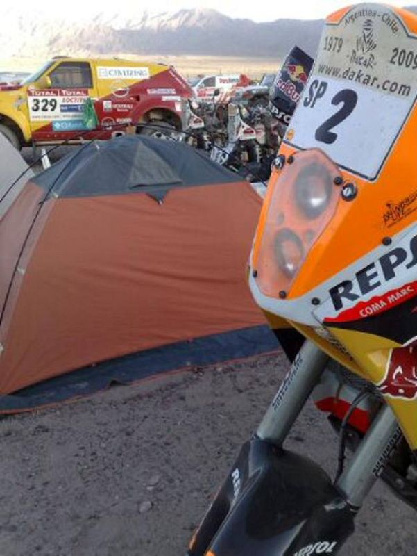 08.01.2009El líder de la general de motos, el español Marc Coma, descansa en su tienda junto a su KTM.MARC MARTÍN