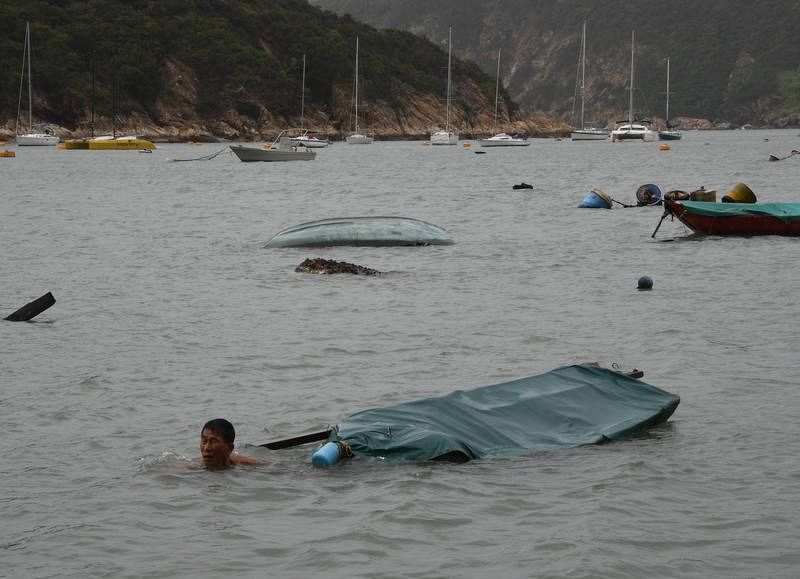 16.09.2018Un pescador intenta salvar los restos de su barca dañada por el tufón Mangkhut en Hong Kong.Mark RALSTON / AFP -