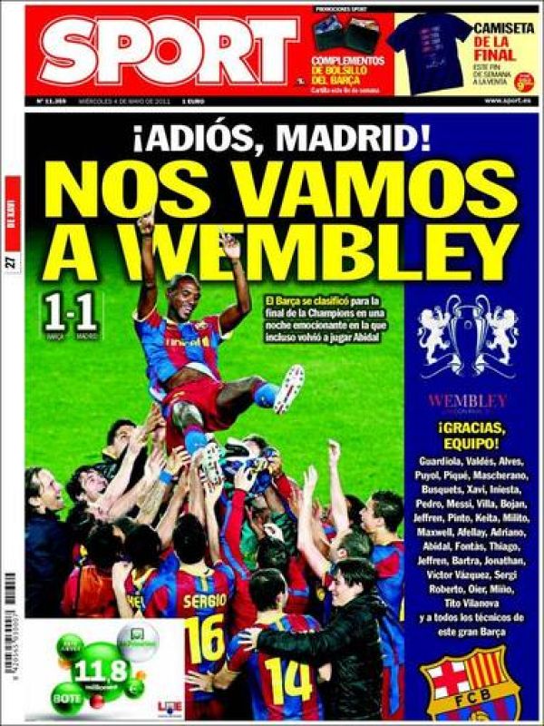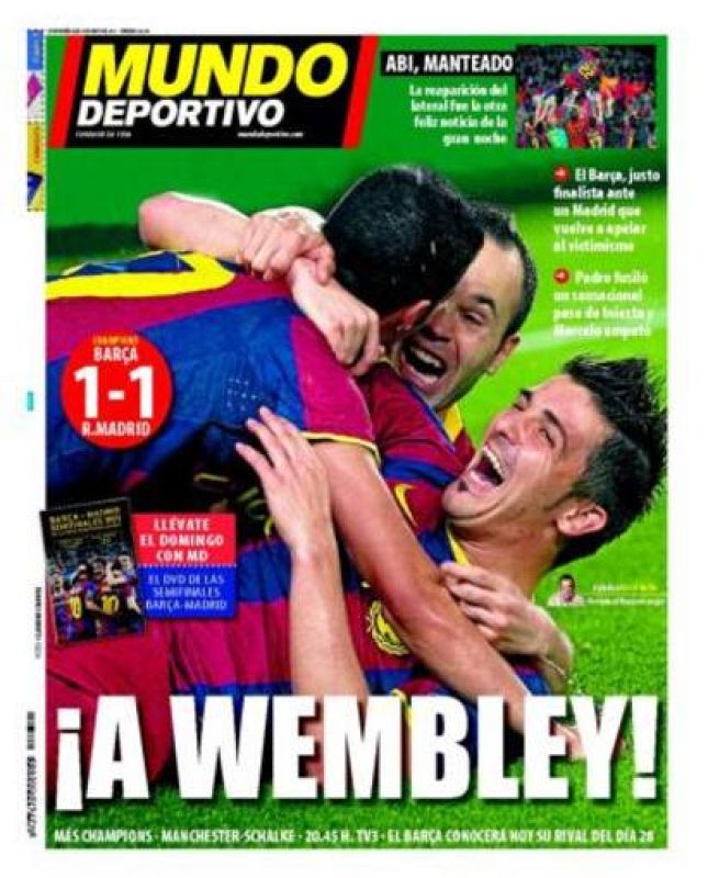 04.05.2011Mundo Deportivo: "Sí, sí, sí, nos vamos a Londres". La imagen es para Pedro y Villa abrazados, pero hay hueco para Abidal en su regresoMundo Deportivo