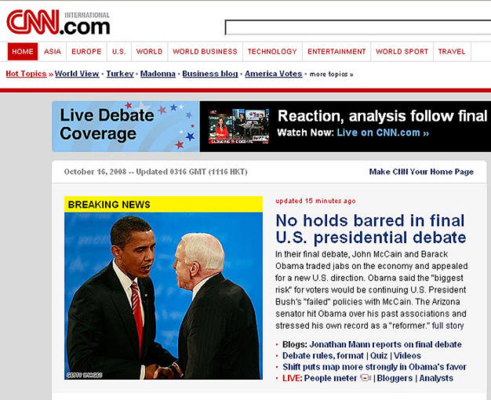 16.10.2008Portada de la web de la Fox tras el último debate -
