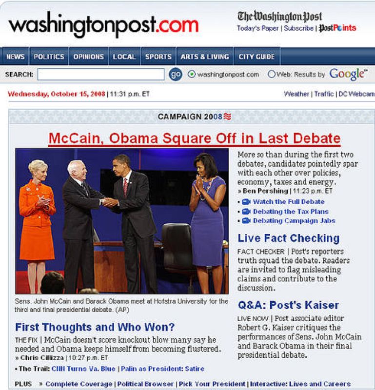 16.10.2008Portada de la web del Washington Post tras el último debate -