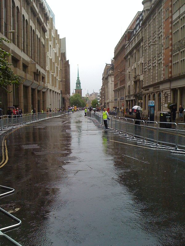 30.07.2012Para los que vivimos en Londres esta vista no se habitual. La lluvia sí, las calles despejadas no. Y para cumplir con todos los estereotipos, la mañana de la maratón amaneció lluviosa pero media hora despues brillaba el sol. ¡¡¡Cómo nos pusimos de animar a nuestras tres representantes!!!Almudena Izquierdo Somovilla -