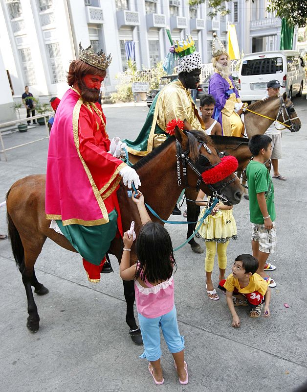 Los tres Reyes Magos entregan velas a los niños filipinos en las calles de Manila. (04/01/10)