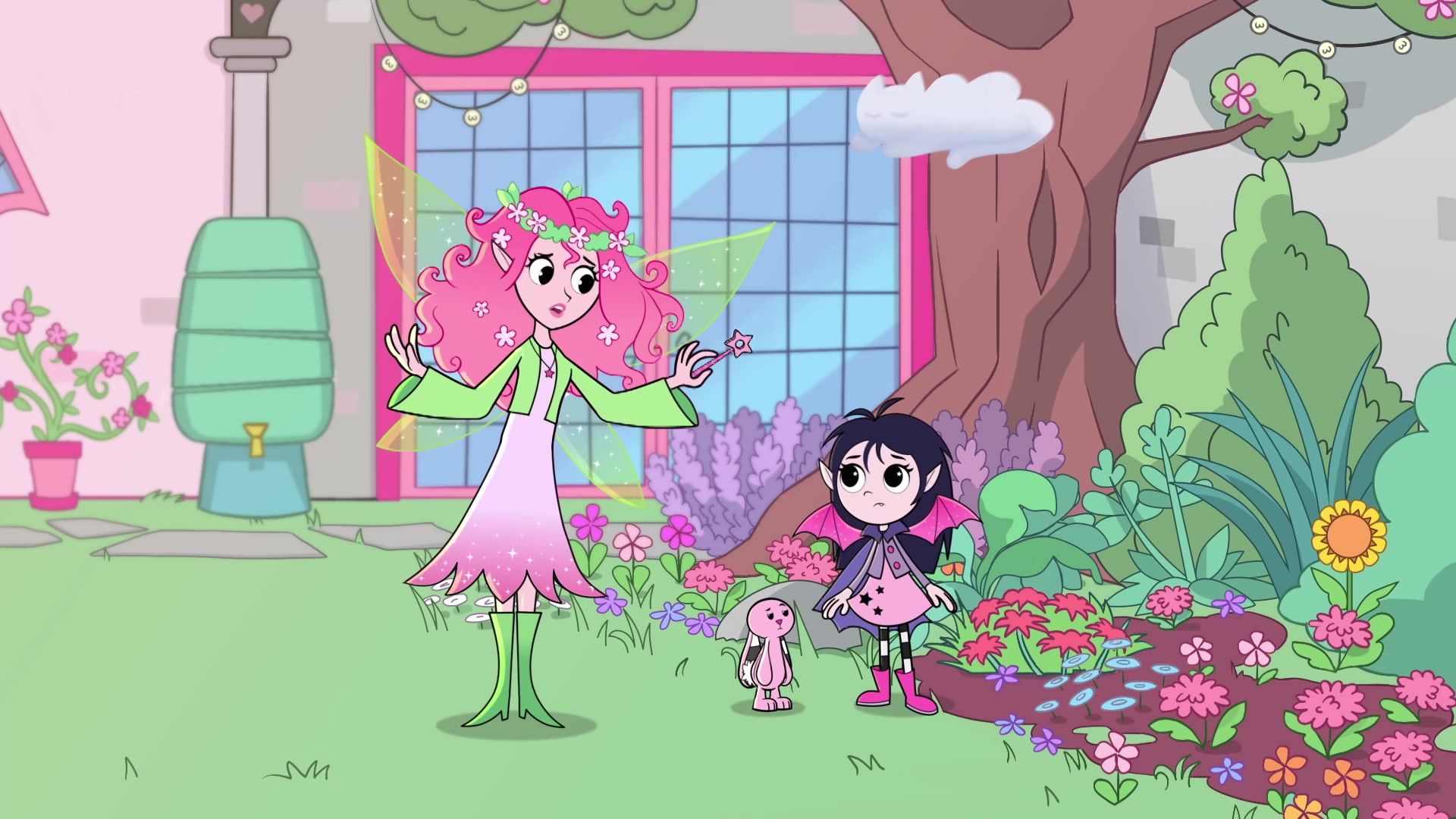 Su mejor amiga en estas peripecias es {*}Pink Rabbit{*}, un conejo rosa muy especial que la acompaña, la anima y muchas veces le sirve como cómplice de sus travesuras y sueños. Además, su familia está formada por personajes cariñosos y peculiares: su {*}madre hada{*}, siempre optimista; su {*}padre vampiro{*}, elegante y protector; y otros amigos con características mágicas, como otros hadas, vampiros, fantasmas y criaturas encantadas.