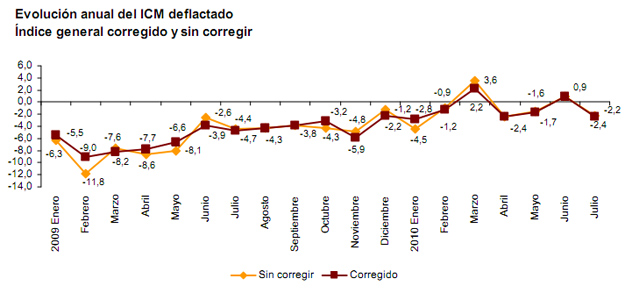 Según los datos del Índice General del Comercio Minorista, desde marzo de 2008, las ventas del comercio al por menor tan sólo han crecido, en términos interanuales, en los meses de marzo y junio de 2010, el resto han sido pérdidas.