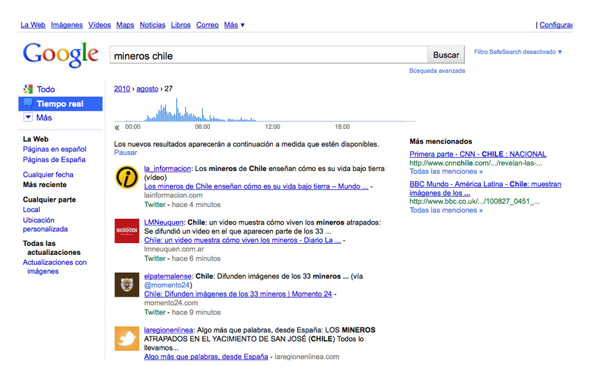 Una búsqueda de 'Chile', por ejemplo, proporciona información cada pocos segundos, pero combina demasiadas noticias distintas; 'mineros Chile' quedaría un poco más afinada. Otras como 'Telefónica' lo hacen cada pocos minutos u horas.