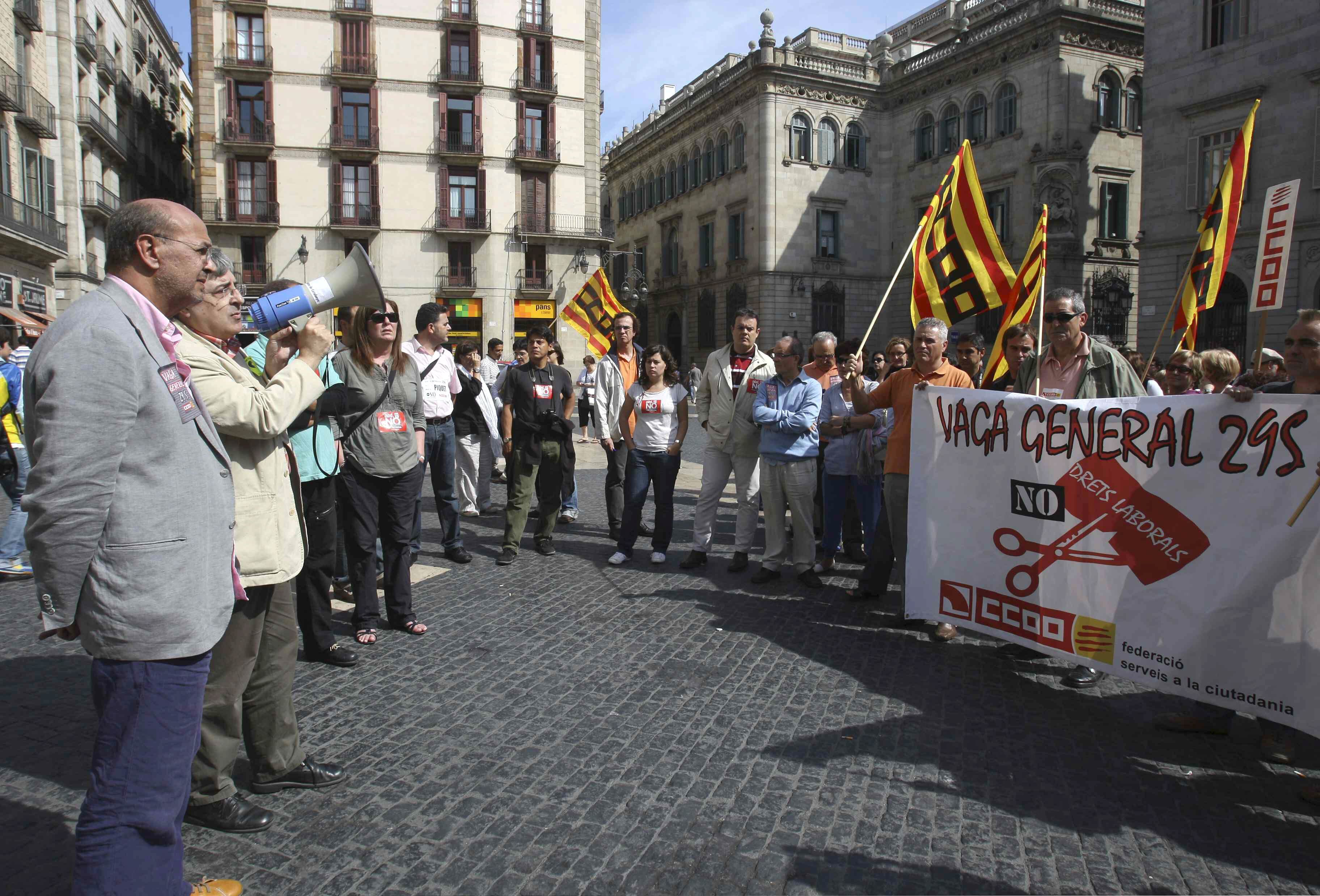 El presidente del Sindicato de Periodistas de Cataluña (SPC), Ramon Espuny, y el secretario general de CC.OO. en Cataluña, Joan Carles Gallego, han asistido a la concentración en la plaza Sant Jaume de Barcelona, junto con otros representantes sindicales y trabajadores de varios periódicos catalanes.