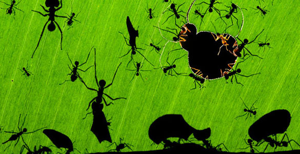 Posiblemente, lo más asombroso de esta fotografía es que fue tomada de noche -en plena oscuridad-, el único momento del día en el que actúan estas hormigas. Y la única manera de conseguirlo era apuntar la cámara por detrás de las hojas. El flash hizo su efecto y las siluetas de las hormigas salieron a relucir.