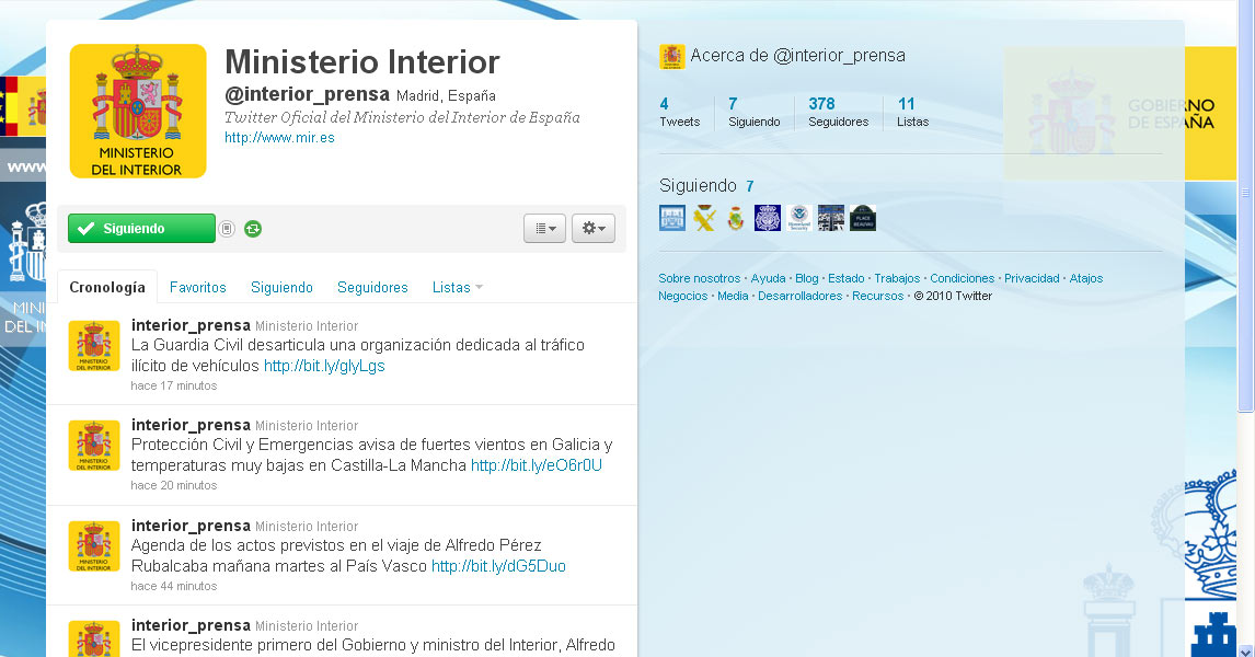 "Bienvenidos al Twitter oficial de la Oficina de Comunicación del Ministerio del Interior de España. Muchas gracias. Un saludo". Con este mensaje estrenaban la cuenta a través de la cual, según señala el Ministerio en un comunicado, Interior dará a conocer las actividades de este departamento y los actos públicos de sus máximos responsables.