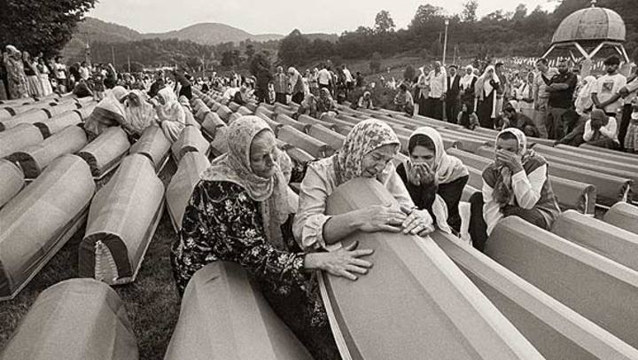 Los familiares sostienen fotos de los desaparecidos. Especialmente crudas son las instantáneas de las madres y esposas de víctimas de Srbrenica, llorando antes del inicio de la ceremonia fúnebre, o las imágenes de las exhumaciones en Abu Ghraib (Iraq).