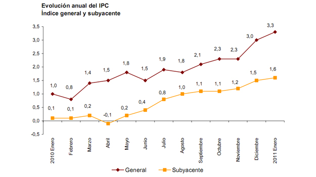 El Índice de Precios de Consumo (IPC) subió tres décimas en enero y situó la tasa interanual en el 3,3%, la mayor desde octubre de 2008, según los datos publicados por el Instituto Nacional de Estadística (INE).