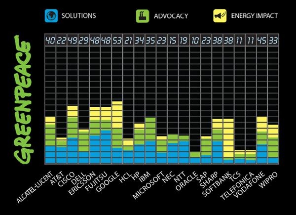En cuanto al Impacto energético, principalmente de los grandes centros de datos y 'granjas de servidores', IBM y Alcatel-Lucent han sido los mejor clasificados. También Cisco, Google, Dell y Wipro ocupan un tercer puesto compartido.