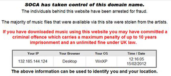 La SOCA tomó el control del dominio web, donde informa de su clausura y la detención porque "la mayoría de los archivos disponibles en el sitio se robaron de los artistas".