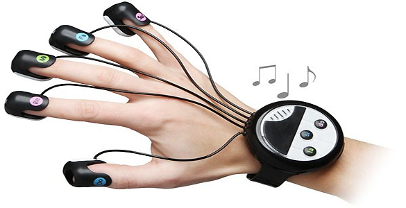 Ambos funcionan por un sistema tan básico como son unos sensores que van en la punta de los dedos. En el caso de los guantes quedan ocultos, mientras que en el del 'piano para dedos' quedan al descubierto, pero con un diseño más moderno y futurista, digno casi de película de ciencia ficción.