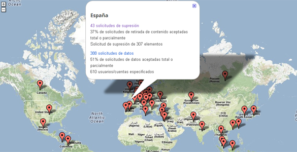 España se encuentra en alguno de los países que han solicitado que se eliminen determinados contenidos. Se ha presentado 43 solicitudes de supresión de las que se han aceptado el 37%, y 388 solicitudes de datos, de las que han aceptado el 51%.