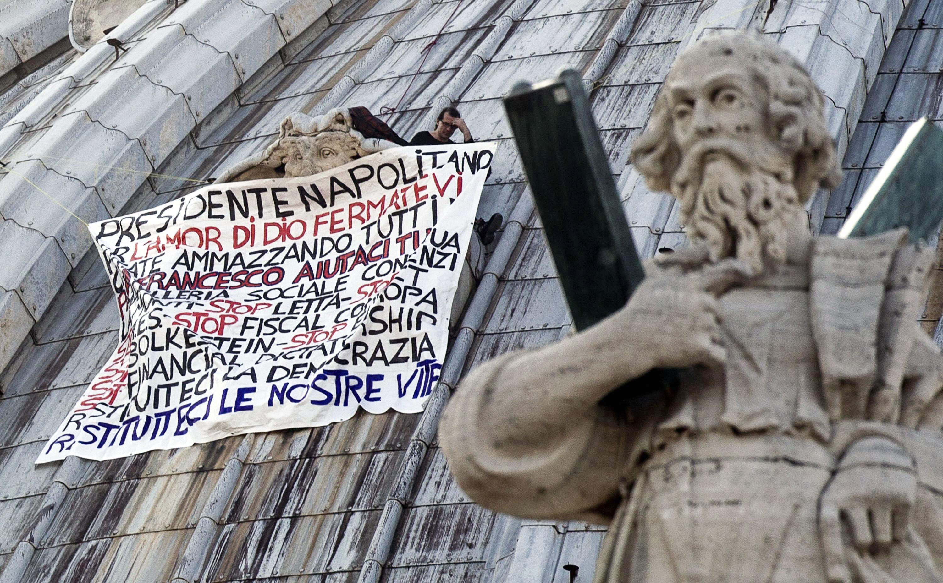 El empresario se encaramó el sábado por la tarde y desplegó una pancarta en la que se dirige al presidente italiano, Giorgio Napolitano, y al papa Francisco y pide "que se detenga todo esto" en relación a las medidas de austeridad.