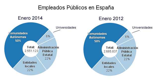 En España hay 2.551.123 empleados públicos registrados en todas las administraciones públicas 134.714 menos que hace dos años, según el último Boletín Estadístico del Personal al Servicio de las Administraciones Públicas correspondiente a enero de 2014.