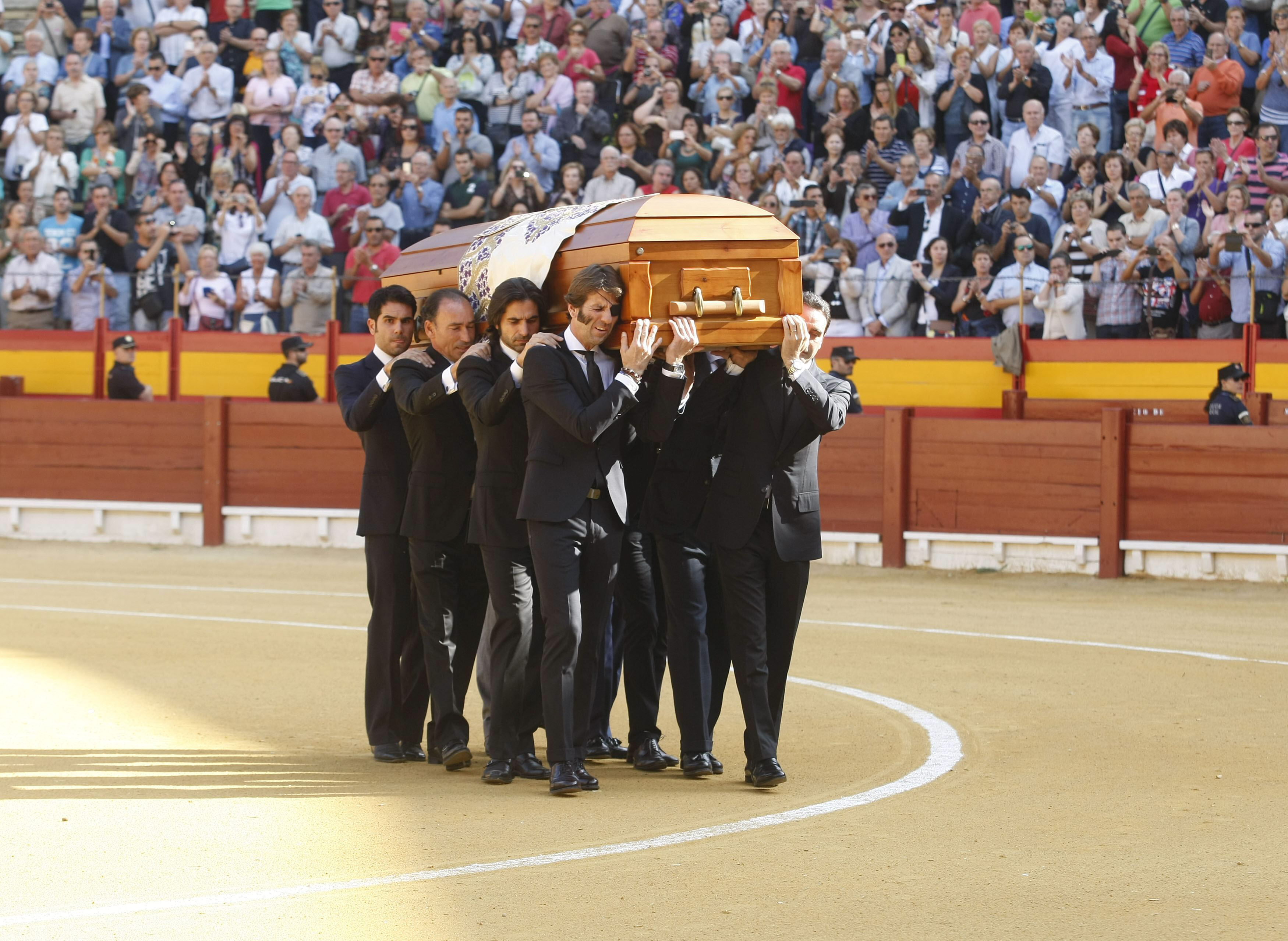 Los restos mortales de Manzanares han permanecido las últimas 24 horas en la Puerta Grande de la plaza alicantina de toros hasta que a las 10.30 horas de este jueves su féretro ha sido portado por una decena de diestros en su última vuelta al ruedo como homenaje.