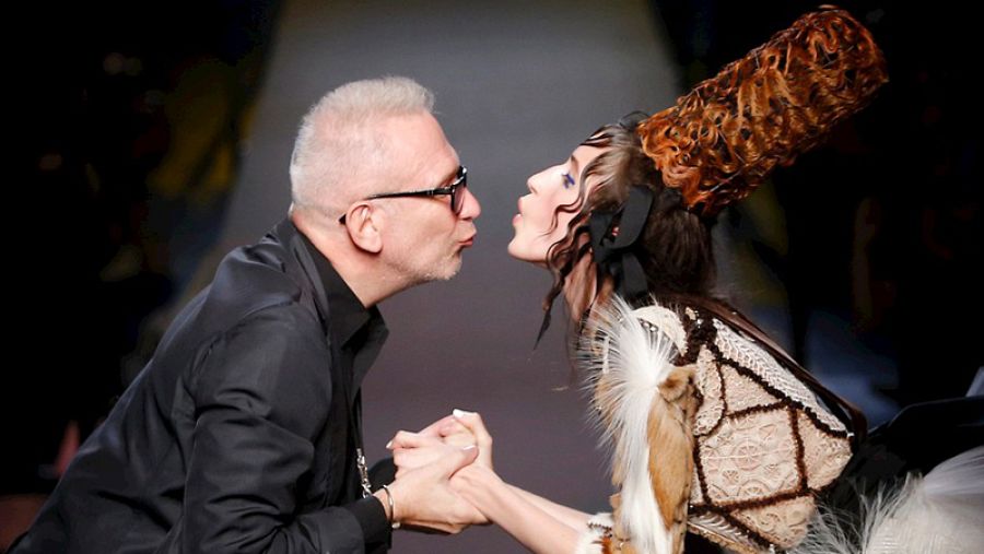El diseñador Jean Paul Gaultier besa a la modelo Anna Cleveland al final del desfile. aFP