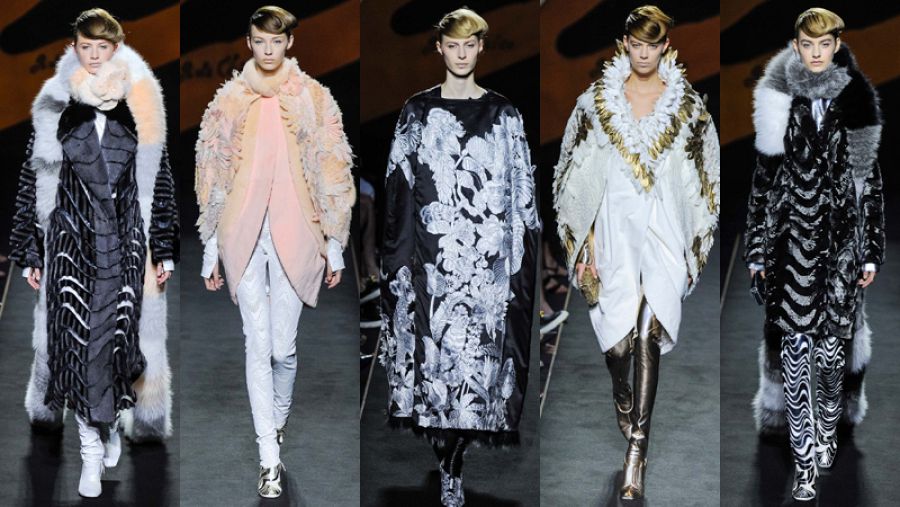 Las texturas en blanco y negro dominan casi toda la propuesta pero permiten que destaquen otros, como las van en rosa palo o las que llevan aplicaciones de oro o plata. Sofisticada, barroca y osada, la colección tiene una fuerte carga dramática, algo que se enfatizó con el telón de fondo que reproducía una pintura de Chirico.