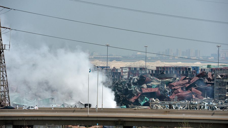 Vista del puerto de Tianjin el domingo, todavía con humo por las explosiones e incendios declarados el miércoles.