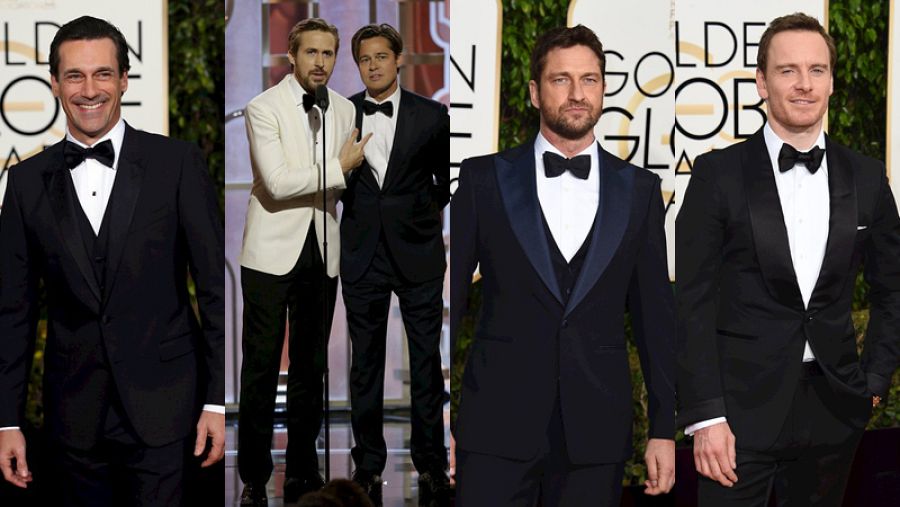 Leonardo DiCaprio, con diseño de Giorgio Armani, Liev Schreiber con traje de Calvin Klein, Gael García Bernal apostó por Dior y la casa Salvatore Ferragamo vistió a Jon Hamm, Channing Tatum y Gerard Butler. Ryan Gosling llevó chaqueta blanca de Ralph Lauren y fue uno de los pocos en salirse del estilo más clásico.