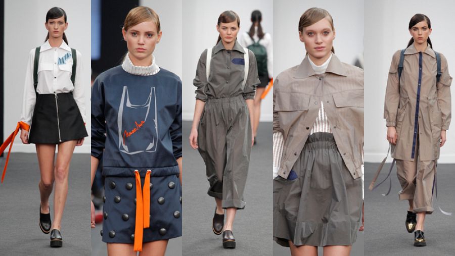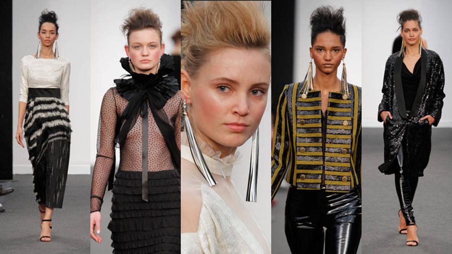 El desfile arranca en negros "rigurosos" con los que tiñe diseños hechos con seda y con tejidos que salen de botellas de plástico. Sigue con prendas de estilo militar "de tejido botella con efecto papel", muy ligero, casi transparente y luego entran las piezas en tonos marino, en tejido de gabardina, decoradas con círculos de plástico "de un montón de alarmas que encontramos en un contenedor", revela Nieto.