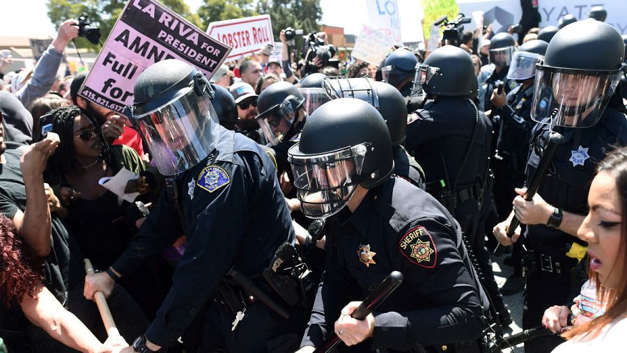 Cientos de personas se han enfrentado este viernes con la Policía a las afueras de un hotel próximo al aeropuerto internacional de San Francisco, donde el precandidato presidencial republicano Donald Trump ha pronunciado un discurso.