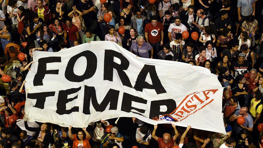 Partidarios de Dilma Rousseff portan una pancarta contra Michel Temer. AFP PHOTO / DOUGLAS MAGNO