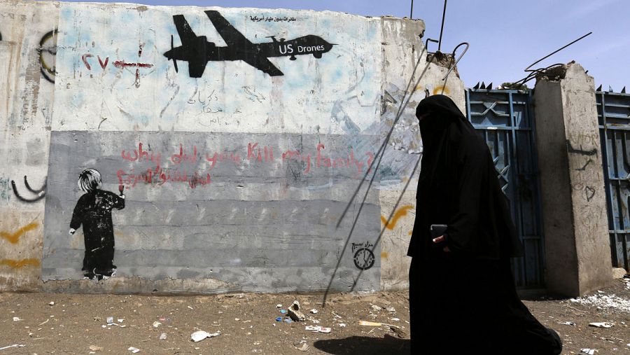 Una mujer camina junto a unas pintadas en contra de los drones estadounidenses y los ataques de EE.UU. contra supuestas pociones de Al-Qaeda en Saná, Yemen EFE/Yahya Arhab