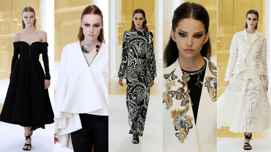En esta colección se hace un enorme mural de blancos y negros, en solitario, conjuntados en contraste, o en estampados vegetales. Un salto al presunto movimiento minimalista que se avecina aunque con matices. Los diseñadores reinterpretan la chaqueta 'Bar' y los vestidos 'Bonbon' que vemos con bordados de lujo - con joyas de oro- que recuerdan a los de los vestidos 'Première soirée' que tan famosos se hicieron en los años 50.