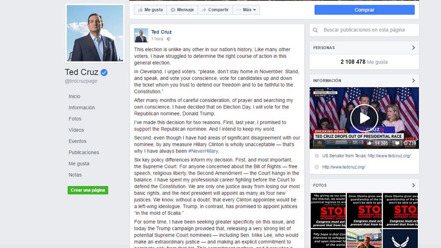 Página Facebook del senador republicano y exaspirante a la nominación de su partido Ted Cruz.