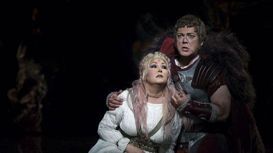 Fotografía facilitada por el Teatro Real de la mezzo-soprano francesa Karine Deshayes (i), en el papel de Adalgisa, y el tenor estadounidense Gregory Kunde, representando a Pollione. EFE/Javier del Real
