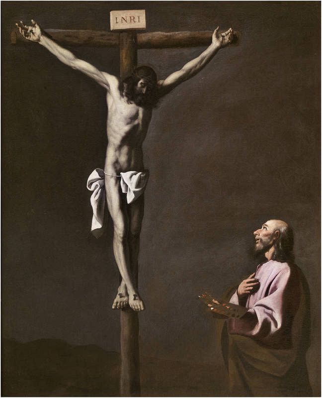 No obstante, el inicio del trayecto lo marca, a modo de declaración de intenciones, el Cristo crucificado contemplado por un pintor (h. 1650) de Francisco de Zurbarán, primera obra que ven los ojos del espectador y que se incluye en la sección 'Los orígenes: la religión', como ejemplo de la cantidad de relatos e imágenes que proliferaron en la Edad Moderna para probar que la pintura o la escultra eran "actividades queridas por la divinidad". También la mitología y la historia grecorromanas, a las que se dedica la sección 'Los orígenes: la mitología', están plagadas de episodios sobre el origen de las artes, desde las historias de Narciso que creó la pintura para contemplar su reflejo en una fuente (Narciso en la fuente, anónimo español del s.XVIII) al Prometeo que robó el fuego de los dioses para dar vida a una escultura.