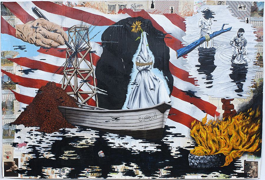 Un total de nueve obras, entre ellas: cuatro óleos, una acuarela, tres dibujos a grafito y una instalación, componen Homeland No Security, cuya obra más antigua expuesta es Great Expeditions (2009), que ayuda a contextualizar la muestra y que entremezcla la esperanza y el sentimiento de culpabilidad histórica. La obra dividida en dos, muestra la bandera americana, y un mar enfangado en basura. En el centro, una barca se abre paso con la palabra “avaricia” escrita en árabe. Sobre ella, un miembro del Ku Klux Klan, asomado al borde de un precipicio maniatado con una soga y ciego, no tiene ojos para poder ver sus actos.