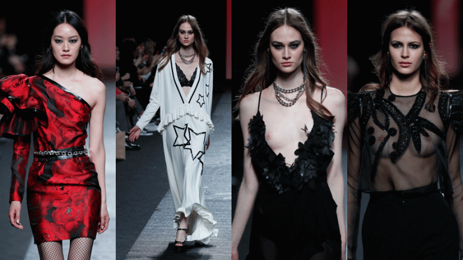 Luego vemos un generoso estampado de flores rojas y poco a poco el negro se va adueñando de la colección para teñir diseños cargados de sensualida, picardía y osadía. Destacan los vestidos del color del azabache con transparencias generosas y bordados orgánicos, y los que llevan escotes vertiginosos.