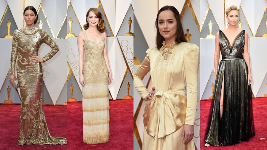 Los tonos metalizados han seducido a Charlize Theron, fiel a la casa dior; Emma Stone, con diseño de Givenchy; Jessica Biel, con vestido de Kaufman Franco; y Dakota Johnson que es una de las fieles seguidoras de Alessandro Michelle, director creativo de Gucci, y ha llevado uno de sus diseños de estilo retro en tono dorado suave y joyas de Cartier.