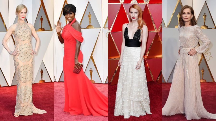 Nicole Kidman ha optado por un diseño de patrón vertical en tono nude y grandes flores en tono perla, y Viola Davis ha llevado uno de los diseños más elegantes de la noche en tono rojo coral. Emma Roberts ha hecho un guiño a la nostalgia y ha llevado un diseño vintage de la casa italiana, con cuerpo de encaje en negro y falda en blanco roto.