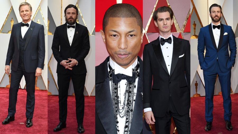 Le sigue Jamie Dornan, con un esmoquin de chaqueta blanca de Hermés. Chris Evans prefirió el color azul y Andrew Garfield se cuela entre los más elegantes. Viggo Mortensen apuesta por el estilo clásico y ha llevado un esmoquien de tres piezas de Dior. Justin Timberlake, con más clase que su pareja, prefirió un esmoquin de Tom Ford, diseñador que firma también el de Garfield.