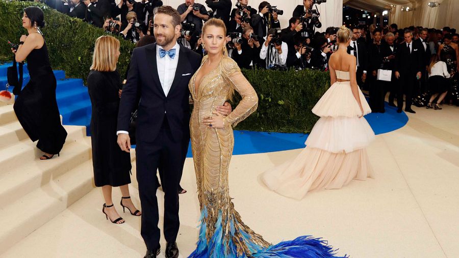 Por su belleza y originalidad, uno de los vestidos más alabados fue el de la actriz Blake Lively, que acudió con su marido Ryan Reynolds y que vistió un Versace dorado, de profundo escote, con una colorida cola formada por plumones de distintos tonos azules.
