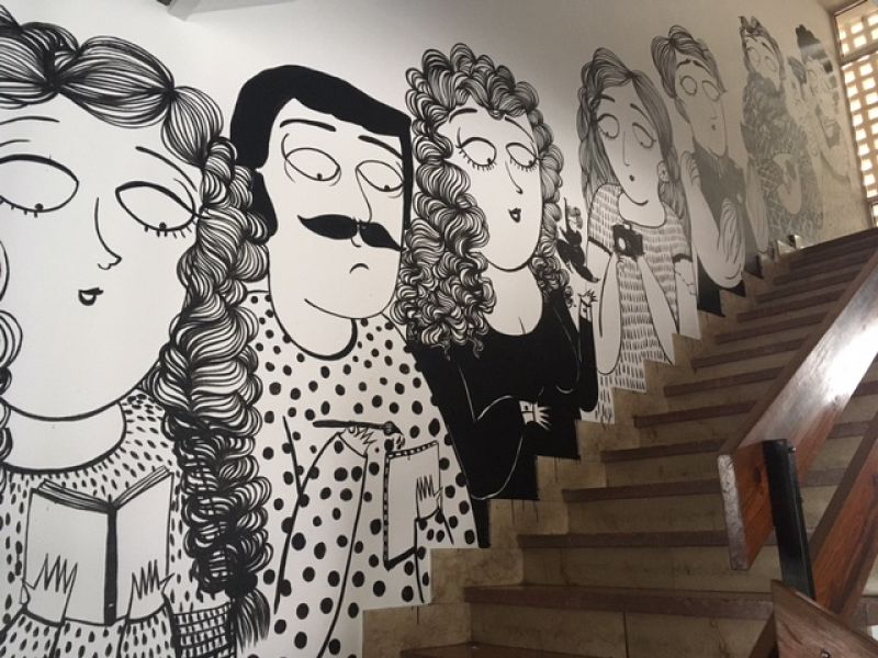 "Cuando surgió la oportunidad de hacer un mural -asegura Sara- solo me dijeron que dentro del espacio hacían actividades culturales como música, danza, teatro y que si quería lo tomara en cuenta para el dibujo. Al llegar allí pude ver de cerca lo que pasaba dentro de la casa y decidí hacer varios personajes que sujetan en sus manos algo que represente una actividad diferente: La lectura, la pintura, la danza, el teatro, la música, el cine, la fotografía. El mural está en la escalera de la entrada y da la bienvenida a todo el que pase por el lugar. Fue un gran honor poder llenar un espacio tan importante para la ciudad con mis dibujos y me dio la oportunidad de conocer personas de la ciudad".