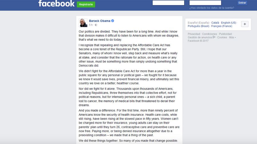 En un mensaje de casi mil palabras publicado su cuenta de la red social Facebook, Obama ha salido en defensa de la ley conocida como Obamacare y ha criticado el plan recién desvelado por los líderes republicanos del Senado para desmantelar y reemplazar esa reforma.