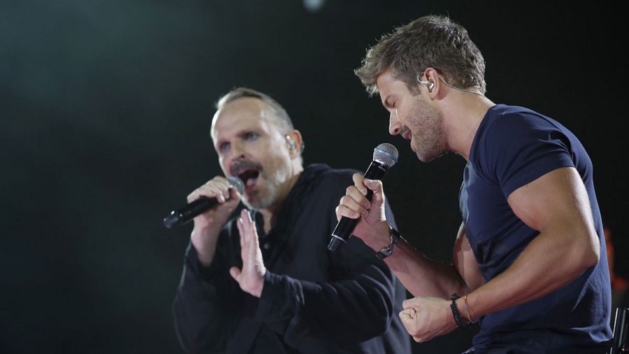 Los cantantes Miguel Bosé y Pablo Alborán (d) durante el concierto. JuanJo Martín