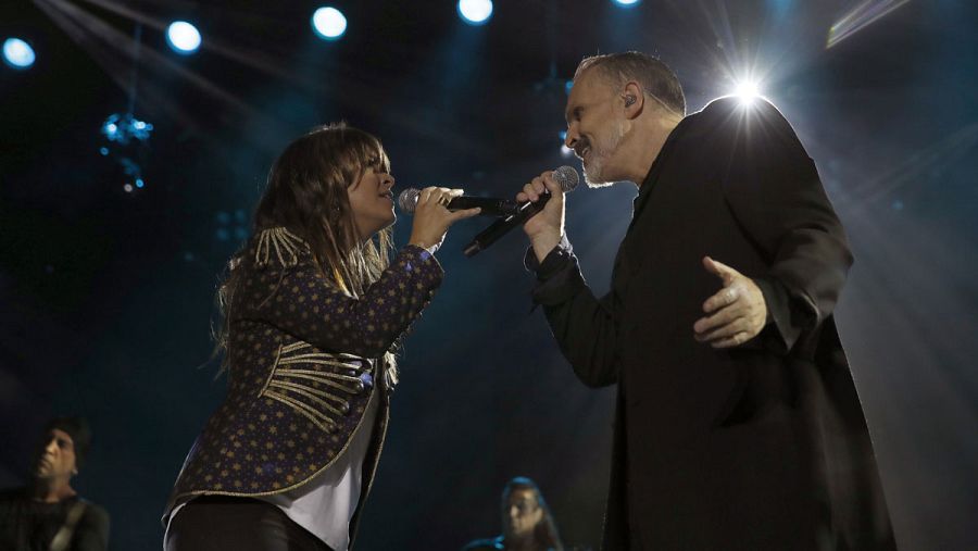 Los cantantes Miguel Bosé y Vanesa Martín (i) durante el concierto. JuanJo Martín