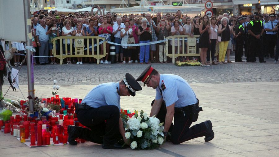 El acto ha concluido con una ofrenda floral en el punto donde un agente de los Mossos d'Esquadra abatió a cuatro de los terroristas antes de que otra dotación de la policía catalana matara al quinto, a unos metros de distancia.