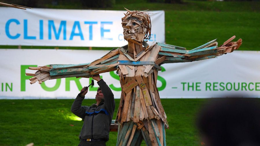 Un hombre construye una figura de madera en el parque Rheinaue durante la COP23. PATRIK STOLLARZ