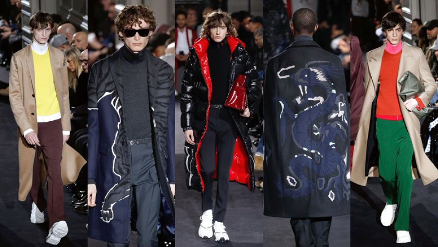 El negro se declina en todas sus expresiones utilizando una amplia variedad de texturas lo que provoca distintos acabados que enriquecen la colección. El italiano propone conjuntos en el mismo tono, lo que se llama total look, siempre con prendas fáciles de llevar. Todo parece sencillo y clásico a primera vista pero no es así. Ocurre especialmente con las prendas de abrigo, como el eterno abrigo en tono camel que lleva ‘pinchos’ de metal en el hombro haciendo un guiño a la estética punk; o las capas y abrigos en tono oscuro decorados con exóticos dragones y tigres que atacan la prenda.