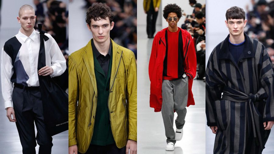 La casa Miyake, que tiene como director creativo al japonés Yusuke Takahashi, sigue esta tendencia y rebaja la intensidad de las prendas logrando un estilo relajado, a veces improvisado. Sus nómadas de ciudad llevan monos y camisas anudados, abrigos de rayas inspirados en el batín de 'andar por casa' y chaquetas que llevan elementos propios de las cazadoras. Y al revés, cazadoras que llevan solapas y botones propios de las chaquetas.
